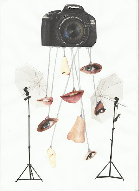 This is a drawing I have done responding to these cut and paste experiments on what I want to do in Photoshop, this then might spark some more ideas and edits. I want to use advertising campaigns, especially skin care ads because of the nature of perfect skin they try to achieve through retouching. I will cut the faces into mask like shapes, and find a way to get the faces looking more fake. I will then use the idea of the skin breaking off from the masks, to emphasis a loss of identity through the falseness of these campaigns. I want to use metal rods/ cables which will hang the masks down from maybe a camera, to give the impression of a puppet like state which these women get in.